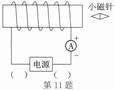 11. 如图所示,电流表正确连接在电路中,通电时请在括号中标出电源正、负极及小磁针静止时的$N$极。