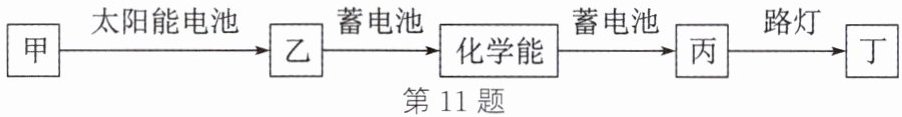 11. 某路灯照明系统的太阳能电池白天将太阳能转化为电能,对蓄电池充电,晚上蓄电池对路灯供电,对如图方框中能量形式判断正确的是 (