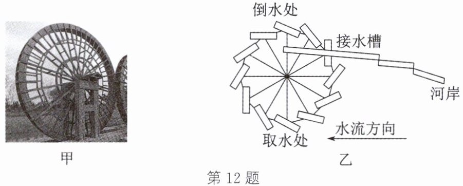 12. (新情境·传统文化)《天工开物》记载了一种农用机械,名为“筒车”,如图甲所示。筒车利用水流冲击水轮,使其旋转。在轮轴上安装的竹筒随着轮轴一起转动,当筒口转到低处时便舀满水,随着轮轴上升,筒口到达高处时倒出水来,以此循环往复,以满足农田灌溉的需求。