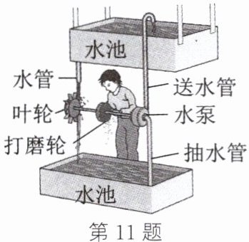 11. 如图所示,这是一个极具想象力的设想,其大意是上面水池中的水流下来,冲击叶轮转动;叶轮带动打磨轮和水泵的轴转动;人利用打磨轮打磨工件,同时,运转的水泵又把流到下面水池中的水抽到上面的水池中……只要一开始在上面水池中注满水,就能通过水的上下循环,使机器不停地工作。