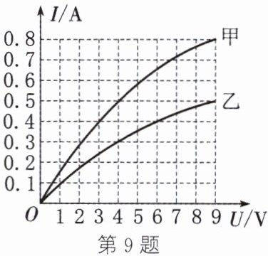9. 甲、乙两灯的电流随电压变化的关系图像如图所示。若将甲、乙两灯并联接入$4\ V$的电路中,则两灯在$5\ min$内消耗的总电能为