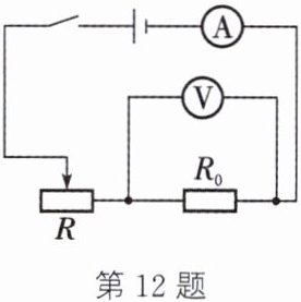 12. 如图,电源电压为$6\ V$,电阻$R_0 = 10\ \Omega$,电流表量程为$0\sim0.6\ A$,电压表量程为$0\sim3\ V$,滑动变阻器$R$上标有“$20\ \Omega\ \ 0.5\ A$”字样。求: