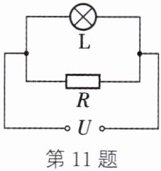 11. 如图所示,灯泡$L$和电阻并联后接在电压为$U$的电路中,已知电阻的阻值为$R$,通过电路的总电流为$I$,则灯泡$L$在$t$时间内消耗的电能是