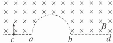 5. (多选)(2024·宁波市镇海中学高二期末)一匀强磁场的磁感应强度大小为$ B $,方向垂直于纸面向里,其边界如图中虚线所示,$ ab $为半径为$ R $的半圆,$ ac $、$ bd $与直径$ ab $共线,$ a $、$ c $间的距离等于半圆的半径$ R $。一束质量均为$ m $、电量均为$ q $的带负电的粒子,在纸面内从$ c $点垂直于$ ac $以不同速度射入磁场,不计粒子重力及粒子间的相互作用。下列说法正确的是