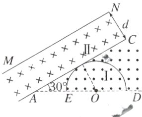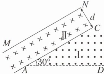 6. (多选)如图所示,在Ⅰ、Ⅱ两个区域内存在磁感应强度大小均为$ B $的匀强磁场,磁场方向分别垂直于纸面向外和向里,$ AD $、$ AC $边界的夹角$ \angle DAC = 30^{\circ} $,边界$ AC $与边界$ MN $平行,Ⅱ区域宽度为$ d $。质量为$ m $、电荷量为$ + q $的粒子可在边界$ AD $上的不同点射入,入射速度垂直$ AD $且垂直磁场,若入射速度大小为$ \frac{qBd}{m} $,不计粒子重力,则