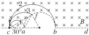 轨迹圆弧所对应的弦与$ab$半圆形边界相切时,圆心角最小,运动时间最短,其轨迹如图中3所示,圆心恰好位于$a$点,由$R=\frac{mv}{qB}$,