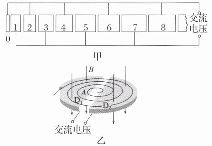 5. (2024·舟山市高二期末)如图所示,图甲为直线加速器,它由多个横截面积相同的金属圆筒共轴依次排列,圆筒长度按照一定的规律依次增加。被加速的带电粒子在金属圆板 0 中心处由静止释放,之后每次通过圆筒间隙都被加速,且加速时间可以忽略不计。图乙为回旋加速器,D₁、D₂为两个中空的半圆形金属盒,处于竖直向下的匀强磁场 B 中。被加速的带电粒子在 A 点由静止释放,之后每次通过 D 形盒间隙都会被加速,且加速时间也可以忽略不计。在粒子运动的过
