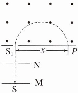 2. (多选)(2024·杭州市高二期末)质谱仪是一种测定带电粒子质量或分析同位素的重要设备,它的构造原理如图所示,离子源 S 产生比荷为 k 的离子束(速度可视为零),经 M、N 两板间大小为 U 的加速电压加速后从小孔 S₁ 垂直于磁感线进入匀强磁场,运转半周后到达照相底片上的 P 点。已知 P 点到小孔 S₁ 的距离为 x,匀强磁场的方向垂直纸面向外,则下列说法不正确的是