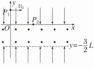5. (12 分)如图所示,平面直角坐标系 xOy 中,在 x 轴上方和 $y = -\frac{3}{2}L$ 下方存在电场强度大小相等、方向相反(均平行于 y 轴)的匀强电场,在 x 轴下方和 $y = -\frac{3}{2}L$ 间存在垂直坐标平面向外的匀强磁场,一质量为 m、电荷量为 q 的带正电粒子,经过 y 轴上的点 $P_1(0,L)$ 时的速率为 $v_0$,方向沿 x 轴正方向,然后经过 x 轴上的点 $P_2(\frac{3}{2}L,0)$ 进入磁场,经偏转垂直 $y = -\frac{3}{2}L$ 虚线进入下方电场,不计粒子重力,$\sin 37° = \frac{3}{5}$,$\cos 37° = \frac{4}{5}$,求: