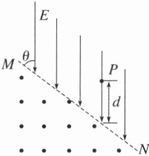 4. (多选)如图所示,虚线 MN 上方为匀强电场,下方为匀强磁场,匀强电场的电场强度大小为 E,方向竖直向下且与边界 MN 成 $\theta = 45°$ 角,匀强磁场的磁感应强度大小为 B,方向垂直纸面向外,在电场中有一点 P,P 点到边界 MN 的竖直距离为 d。现将一质量为 m、电荷量为 q 的带正电粒子从 P 处由静止释放(不计粒子所受重力,电场和磁场范围足够大)。则下列说法正确的是