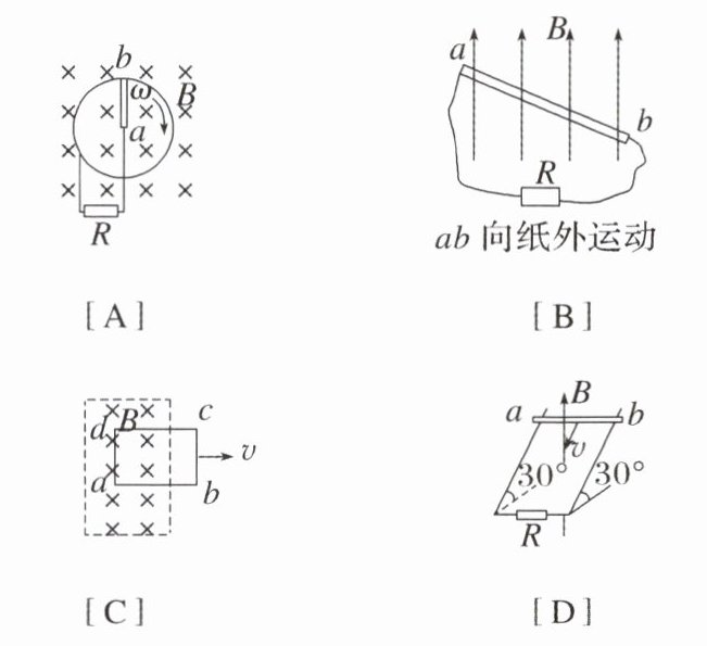 5.A [题中四图都属于闭合电路的一部分导体切割磁感线,应用右手定则判断可得:A中电流方向为$a\to b$,B中电流方向为$b\to a$,C中电流方向沿$a\to d\to c\to b\to a$,D中电流方向为$b\to a$,故选项A正确。]