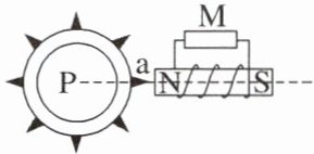 9. 现代汽车中有一种先进的制动装置,它让车轮在制动时不完全抱死滑行,而是仍有一定的滚动。其原理如图所示,铁质齿轮P与车轮同步转动,右端有一个绕有线圈的磁体,M是一个电流检测器。当车轮带动齿轮转动时,由于尖齿靠近磁体时被磁化,使磁场增强;尖齿离开磁体时磁场减弱,于是线圈中产生了感应电流。将这个电流放大后去控制制动机构,可有效地防止车轮被制动抱死。在尖齿a转过虚线位置的前、后,下列说法正确的是