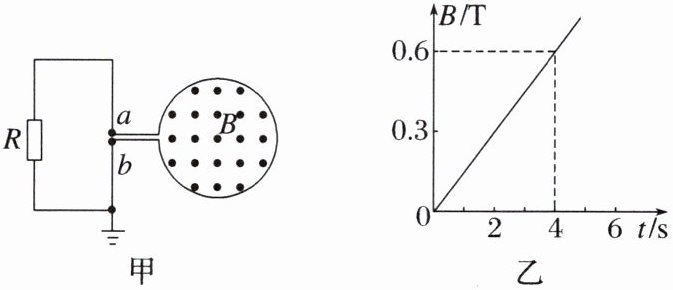 5. (2024·湖州市高二期末)如图甲所示,单匝线圈电阻r=1Ω,线圈内部存在垂直纸面向外的匀强磁场,磁场面积为S=0.2m2,有一个阻值为R=2Ω的电阻两端分别与线圈两端a、b相连,电阻的一端b接地。磁感应强度B随时间t变化的规律如图乙所示,则