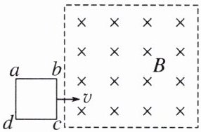 4. AC [金属线框 $bc$ 边刚进入磁场时,根据右手定则,可判断出线圈中感应电流的方向是逆时针方向,A 正确;当金属线框 $bc$ 边刚进入磁场时,$bc$ 边相当于电源,产生的电源电动势为 $E = Blv$,$bc$ 两端的电压为 $U_{bc} = \frac{3}{4}E = \frac{3}{4}Blv$,B 错误;$ab$ 边相当于电阻,$ab$ 两端的电压为 $U_{ab} = -U_{ba} = -\frac{1}{4}E = -\frac{1}{4}Blv$,C 正确;因为线框匀速穿过有界匀强磁场,所以有 $E = Blv$,$I = \frac{E}{R}$,$Q = I^2Rt$,$t = \frac{2l}{v}$,联立,解得 $Q = \frac{2B^2l^3v}{R}$,D 错误。]