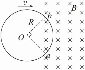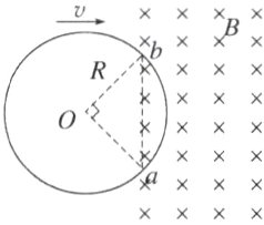 由几何关系知有效切割长度为 $ab = \sqrt{R^2 + R^2} = \sqrt{2}R$,所以产生的电动势为 $E = BLv = B · \sqrt{2}Rv$,电流的方向为 $a \to b$,所以 $U_{ab} < 0$,由于在磁场部分的阻值为整个圆环阻值的 $\frac{1}{4}$,所以 $U_{ab} = -\frac{3}{4}B · \sqrt{2}Rv = -\frac{3\sqrt{2}}{4}BRv$,故选 D。]