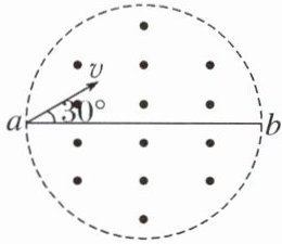 【例 4】(2024·温州市高二期末)如图所示,在圆形区域内存在垂直纸面向外的匀强磁场,ab 是圆的一条直径。一带正电的粒子从 a 点射入磁场,速度大小为 v,方向与 ab 成 30°角时恰好从 b 点飞出磁场,粒子在磁场中运动的时间为 t。若仅将速度大小改为 0.5v,则粒子在磁场中运动的时间为(不计带电粒子所受重力)( )