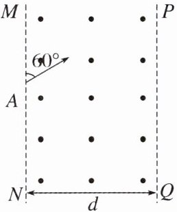 【例 1】如图所示,宽为 $ d $ 的带状区域内有垂直纸面向外的匀强磁场,磁感应强度大小为 $ B $,一质量为 $ m $、电荷量为 $ e $ 的质子从 $ A $ 点出发,与边界成 $ 60^{\circ} $ 角进入匀强磁场。