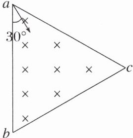【例 5】(多选)如图所示,边长为 L 的正三角形 abc 区域内存在垂直于纸面向里的匀强磁场,质量为 m、电荷量均为 q 的三个粒子 A、B、C 以大小不等的速度从 a 点沿与 ab 边成 30°角的方向垂直射入磁场后从 ac 边界穿出,穿出 ac 边界时与 a 点的距离分别为 $\dfrac{L}{3}$、$\dfrac{2L}{3}$、L。不计粒子的重力及粒子间的相互作用,则下列说法正确的是(