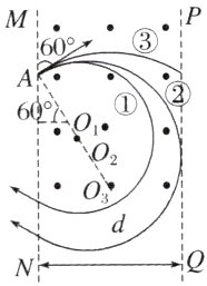 (2)由$r = \frac{mv}{eB}$得$r_2 = \frac{2}{3}d$,最远点至$MN$的距离$L_2 = r_2 + r_2\cos60° = d$,此时轨迹与边界$PQ$相切,轨迹如图中②所示。