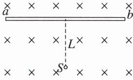 【例 2】(2025·浙江金华卓越联盟高二阶段考试)如图,真空室内存在匀强磁场,磁场方向垂直于纸面向里,磁场内有一块足够大平面感光板 $ ab $,板面与磁场方向平行,在距 $ ab $ 的距离 $ L $ 处有一个点状的 $ \alpha $ 粒子放射源 $ S $,它向平面内各个方向均匀发射带正电的 $ \alpha $ 粒子(重力不计),$ \alpha $ 粒子的速度大小都是 $ v $。(已知 $ \alpha $ 粒子的电荷与质量之比为 $ \frac{q}{m} $,磁感应强度大小为 $ B $,速度大小 $ v = \frac{BqL}{m} $,发射源与 $ ab $ 板距离为 $ L $),现只考虑在图纸平面中运动的 $ \alpha $ 粒子,粒子间相互作用忽略不计,求: