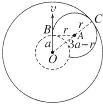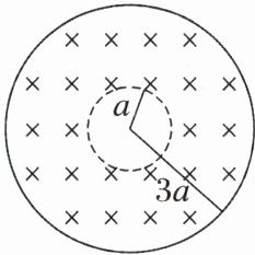 (2020·全国卷Ⅲ)真空中有一匀强磁场,磁场边界为两个半径分别为 $ a $ 和 $ 3a $ 的同轴圆柱面,磁场的方向与圆柱轴线平行,其横截面如图所示。一速率为 $ v $ 的电子从圆心沿半径方向进入磁场。已知电子质量为 $ m $,电荷量为 $ e $,忽略重力。为使该电子的运动被限制在图中实线圆围成的区域内,磁场的磁感应强度最小为( )