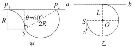 (1)洛伦兹力提供向心力,由牛顿第二定律有$qvB = m\frac{v^2}{R}$,解得$R = L$,轨迹如图甲所示,$ab$上被$\alpha$粒子打中的区域的长度$x = L + \sqrt{(2L)^2 - L^2} = (\sqrt{3} + 1)L$。