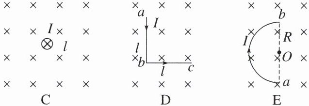 解析 A图中,$F_A = IlB\cos\alpha$;B图中,导线在纸平面内,因此$B\perp I$,故$F_B = IlB$;C图中电流方向与磁场方向平行,$F_C = 0$;D图中是两根导线组成的折线$abc$,整体有效长度为$ac = \sqrt{2}l$,故$F_D = \sqrt{2}IlB$;E图中是沿$a\rightarrow b$的半圆形电流,其有效长度为$ab = 2R$,则$F_E = 2IRB$。