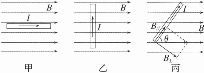 3. 丙图中,通电导线的方向和磁场的方向夹角为$\theta$,把磁感应强度$B$分解为与导线垂直的分量$B_{\perp}=$