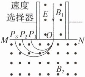 如图为某质谱仪的示意图,由竖直放置的速度选择器、偏转磁场构成。由三种不同粒子组成的粒子束以某速度沿竖直向下的方向射入速度选择器,该粒子束沿直线穿过底板上的小孔$O$进入偏转磁场,最终三种粒子分别打在底板$MN$上的$P_1$、$P_2$、$P_3$三点,已知底板$MN$上下两侧的匀强磁场方向均垂直纸面向外,且磁感应强度的大小分别为$B_1$、$B_2$,速度选择器中匀强电场的电场强度的大小为$E$,不计粒子的重力以及它们之间的相互作用,则(
