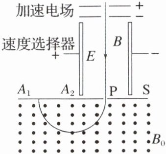 如图所示是质谱仪的工作原理示意图。带电粒子被加速电场加速后,进入速度选择器。速度选择器内相互正交的匀强磁场和匀强电场的强度分别为$B$和$E$。平板$S$上有可让粒子通过的狭缝$P$和记录粒子位置的胶片$A_1A_2$,平板$S$下方有磁感应强度为$B_0$的匀强磁场。下列表述正确的是(