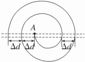 某同学在分析带电粒子运动轨迹时,画出了如图所示的轨迹图,他认为两个$D$形盒中粒子加速前后相邻轨迹间距$\Delta d$是相等的。请通过计算分析该轨迹是否合理?若不合理,请描述合理的轨迹其间距会有怎样的变化趋势?