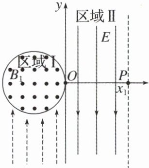 现代高能粒子实验中需要获取轨迹可控的高能粒子,发现用磁场约束粒子运动轨迹的方法十分有效。空间中存在三个有电场或磁场的区域,区域Ⅰ是半径为 $\frac{R}{2}$ 的圆形区域,区域Ⅰ中存在磁感应强度大小为 $B_1 = B$ 的垂直于纸面向外的匀强磁场;区域Ⅱ在 $0 \leq x \leq x_1$ 区间内存在平行 $y$ 轴的匀强电场,$x_1 = R$,电场强度大小 $E = \frac{qRB^2}{4m}$,电场强度方向沿着 $y$ 轴负方向,坐标为 $(R,0)$ 的 $P$ 点是边界上一点。一群质量为 $m$,电荷量为 $+q$ 的带电粒子沿着 $+y$ 方向射入区域Ⅰ,其坐标 $x$ 范围为 $(-0.9R,-0.1R)$,要求这批粒子从同一点离开区域Ⅰ。(不计粒子重力,$\sin 53^{\circ} = 0.8$)求: