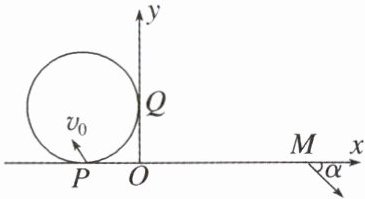 如图所示,在 $xOy$ 平面的第Ⅱ象限内有半径为 $R$ 的圆分别与 $x$ 轴、$y$ 轴相切于 $P$、$Q$ 两点,圆内存在垂直于 $xOy$ 平面向外的匀强磁场。在第Ⅰ象限内存在沿 $y$ 轴负方向的匀强电场,电场强度大小为 $E$。一带正电的粒子(不计重力)以速率 $v_0$ 从 $P$ 点射入磁场后恰好垂直 $y$ 轴进入电场,最后从 $M(3R,0)$ 点射出电场,出射方向与 $x$ 轴正方向夹角为 $\alpha$,且满足 $\alpha = 45^{\circ}$。下列判断正确的是( )