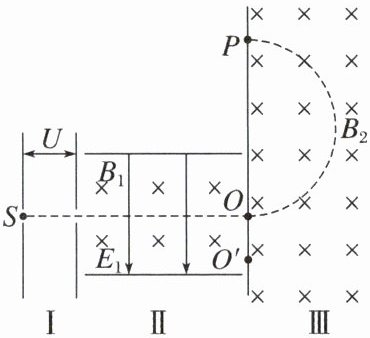 (2)在III中由洛伦兹力提供向心力$qv_0B_2 = m \frac{v_0^2}{r}$,可得$O$点到$P$点的距离为$OP = 2r = \frac{4UB_1}{E_1B_2}$。