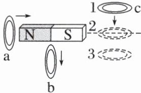 C.圆环c经过磁体右边的位置2时磁通量为0,感应电流为0