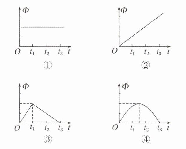 C [根据法拉第电磁感应定律可知感应电动势与磁通量的变化率成正比,即$ E = n\frac{\Delta\Phi}{\Delta t},$结合数学知识可知:穿过闭合回路的磁通量$ \Phi $随时间 t 变化的图像的斜率$ k=\frac{\Delta\Phi}{\Delta t};$题图①中磁通量$ \Phi $不变,无感应电动势;题图②中磁通量$ \Phi $随时间 t 均匀增大,图像的斜率 k 不变,即产生的感应电动势不变;题图③中回路在$ 0~t_1 $时间内磁通量$ \Phi $随时间 t 变化的图像的斜率为$ k_1,$在$ t_1~t_2 $时间内磁通量$ \Phi $随时间 t 变化的图像的斜率为$ k_2,$从图像中发现:$k_1 $大于|$k_2$|,所以在$ 0~t_1 $时间内产生的感应电动势大于在$ t_1~t_2 $时间内产生的感应电动势;题图④中磁通量$ \Phi $随时间 t 变化的图像的斜率的绝对值先变小后变大,所以感应电动势先变小后变大。故选 C。]