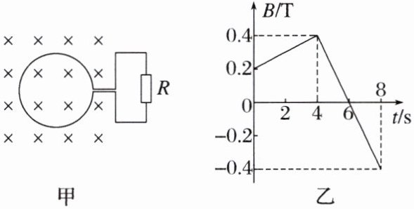 如图甲所示,有一个圆形线圈,匝数 $ n = 1000 $ 匝,面积 $ S = 200\,cm^2 $,线圈的电阻 $ r = 1\,\Omega $,线圈外接一个阻值 $ R = 4\,\Omega $ 的电阻,其余电阻不计,把线圈放入一方向垂直于线圈平面向里的匀强磁场中,磁感应强度大小随时间变化的规律如图乙所示(规定垂直线圈平面向里为磁感应强度的正方向),求: