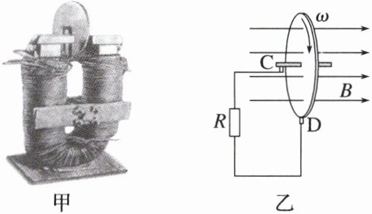 (2024·湖州市高二期末)图甲是法拉第在一次会议上展示的圆盘发电机,图乙是这个圆盘发电机的示意图。铜盘安装在水平的铜轴上,它的边缘正好在两磁极之间,两块铜片 $ C $、$ D $ 分别与转动轴和铜盘的边缘接触。若铜盘半径为 $ L $,匀强磁场的磁感应强度为 $ B $,从左往右看,铜盘以角速度 $ \omega $ 沿顺时针方向匀速转动,则(