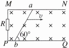 如图所示,$ MN $、$ PQ $ 为两条平行的水平放置的金属导轨,左端接有定值电阻 $ R $,金属棒 $ ab $ 斜放在两导轨之间,与导轨接触良好,$ ab = L $。磁感应强度为 $ B $ 的匀强磁场垂直于导轨平面,设金属棒与两导轨间夹角为 $ 60° $,以速度 $ v $ 水平向右匀速运动,不计导轨和金属棒的电阻,则流过金属棒的电流为(
