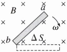 取棒上一小段长度为$\Delta x$(离$b$端距离为$x$),该段产生的感应电动势$\Delta E = B\frac{x\omega\Delta t}{\Delta t}\Delta x = B\omega x\Delta x$,