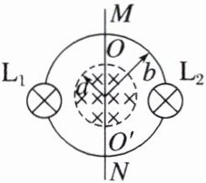 半径为 $ a $ 的圆形区域内有匀强磁场,磁感应强度为 $ B = 0.2 \, T $,磁场方向垂直纸面向里,半径为 $ b $ 的金属圆环与磁场同心地放置,磁场与环面垂直,其中 $ a = 0.4 \, m $,$ b = 0.6 \, m $,金属环上分别接有灯 $ L_1 $、$ L_2 $,两灯的电阻均为 $ R = 2 \, \Omega $,一金属棒 $ MN $ 与金属环接触良好,棒与环的电阻均忽略不计。