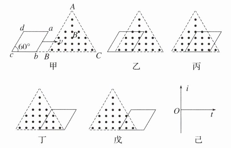 (2) 以 $ ab $ 边刚进磁场时为零时刻,规定线框中感应电流沿顺时针方向时为正,在图己中画出感应电流 $ i $ 与时间 $ t $ 的关系图线。