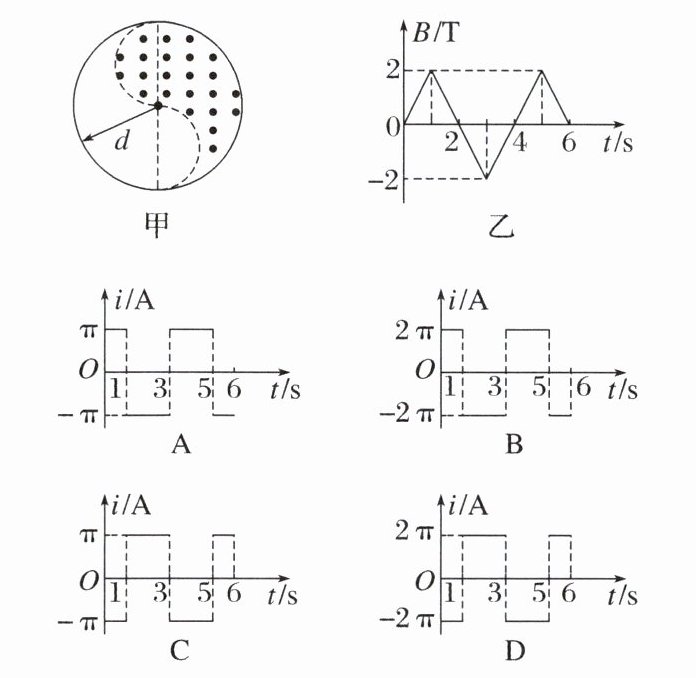 (2024·杭州师范大学附中高二期中) 如图甲所示,一根电阻 $ R = 4 \, \Omega $ 的导线绕成半径 $ d = 2 \, m $ 的圆环,在圆内部分区域存在变化的匀强磁场,中间“S”形虚线是两直径均为 $ d $ 的半圆,磁感应强度随时间的变化如图乙所示(磁场垂直于纸面向外为正,电流顺时针方向为正),关于环中感应电流随时间变化的图像,下列选项中正确的是 (