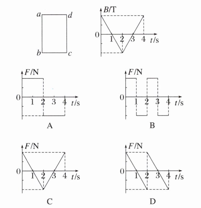 (2024·舟山中学高二月考) 矩形导线框 $ abcd $ 放在匀强磁场中静止不动,磁场方向与线框平面垂直,磁感应强度 $ B $ 随时间 $ t $ 变化的图像如图所示。设 $ t = 0 $ 时刻,磁感应强度的方向垂直纸面向里,则在 $ 0 \sim 4 \, s $ 时间内,选项图中能正确反映线框 $ ab $ 边所受的安培力 $ F $ 随时间 $ t $ 变化的图像是(规定 $ ab $ 边所受的安培力向左为正) (