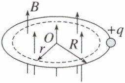(2024·浙江省高二期中)英国物理学家麦克斯韦认为,磁场变化时会在空间激发感生电场。如图所示,一个半径为 R 的绝缘粗糙细圆环水平放置,环内存在半径为 r 的匀强磁场区域,磁场方向竖直向上,环上套一电荷量为+q、质量为 m 的绝缘小球。已知小球与圆环间的动摩擦因数为 μ,磁感应强度 B 随时间变化规律为$B = B_0 + kt$,小球在环上恰好做匀速圆周运动,若小球在环上运动一周,则摩擦力对小球所做功的大小是(