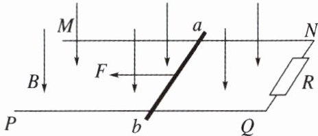 如图所示,空间存在方向竖直向下的匀强磁场,磁感应强度为 $ B $,$ MN $、$ PQ $ 是水平放置的足够长的平行长直导轨,其间距为 $ L $,电阻 $ R $ 接在导轨一端,导体棒 $ ab $ 跨接在导轨上,质量为 $ m $,接入电路的电阻为 $ r $。导体棒和导轨间的动摩擦因数为 $ \mu $。从零时刻开始,对 $ ab $ 棒施加一个大小为 $ F $、方向水平向左的恒定拉力,使其从静止开始沿导轨滑动,$ ab $ 棒始终保持与导轨垂直且接触良好。