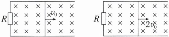 如图所示,水平固定且足够长的光滑 U 形金属导轨处于竖直向下的匀强磁场中,磁感应强度大小为 B,在导轨上放置金属棒。定值电阻的阻值为 R,金属棒的电阻为 r,导轨宽度为 L。若棒分别以初速度 $ v_0 $、$ 2v_0 $ 向右运动,