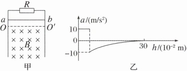 如图甲所示,电阻不计且间距 $ L = 1.5 \, m $ 的光滑平行金属导轨竖直放置,上端接一阻值 $ R = 2 \, \Omega $ 的电阻,虚线 $ OO' $ 下方有垂直于导轨平面向里的匀强磁场,现将质量 $ m = 0.2 \, kg $、电阻 $ r = 1 \, \Omega $ 的金属杆 ab 从 $ OO' $ 上方某处由静止释放。金属杆在下落的过程中与导轨保持良好接触且始终水平。已知杆 ab 进入磁场时的速度 $ v_0 = 1 \, m/s $,下落 $ 0.3 \, m $ 的过程中加速度 a 与下落距离 h 的关系图像如图乙所示,g 取 $ 10 \, m/s^2 $。求: