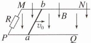 (多选)如图所示,水平面上有两根足够长的光滑平行金属导轨 MN 和 PQ,两导轨间距为 L,导轨电阻均可忽略不计。在 M 和 P 之间接有一阻值为 R 的定值电阻,导体杆 ab 质量为 m、电阻也为 R,并始终与导轨垂直且接触良好。整个装置处于方向竖直向下、磁感应强度大小为 B 的匀强磁场中。现给 ab 杆一个初速度 $ v_0 $,使杆向右运动,最终 ab 杆停止在导轨上。下列说法正确的是 (