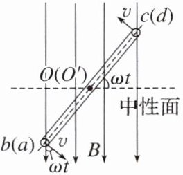如图所示,单匝矩形线圈平面绕bc边的中点从中性面开始转动,角速度为ω,经过时间t,线圈转过的角度是ωt,ab边的线速度v的方向跟磁感线方向间的夹角也等于ωt。设ab边长为L₁,bc边长为L₂,线圈面积S = L₁L₂,磁感应强度为B,则: